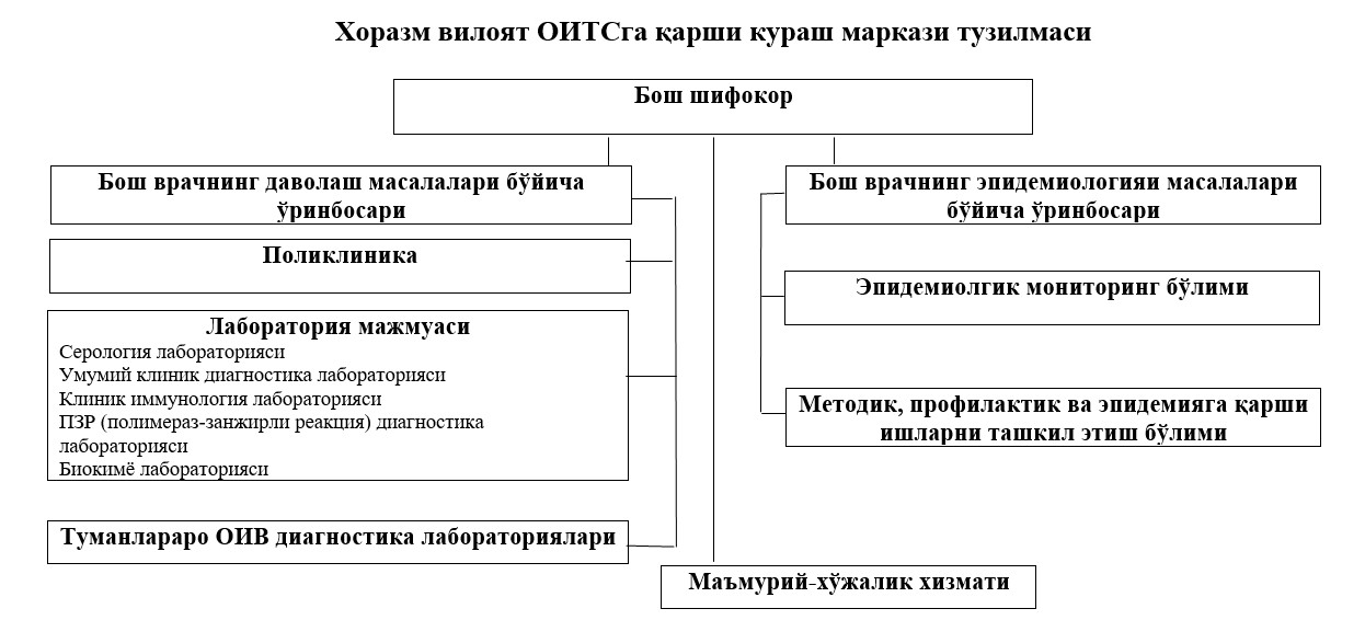 Xorazm viloyat viloyati OITSga qarshi kurash markazi faoliyati va tuzilmasi. Epidemiologik monitoring, Poliklinika, Uslubiy profilaktika va epidemiyaga qarshi tadbirlarni tashkil etish bo‘limi, Laboratoriya majmuasi va tumanlararo OIV taxlil laboratoriyalari mavjud.Markazning Uslubiy profilaktika va epidemiyaga qarshi tadbirlarni tashkil etish bo‘limi.